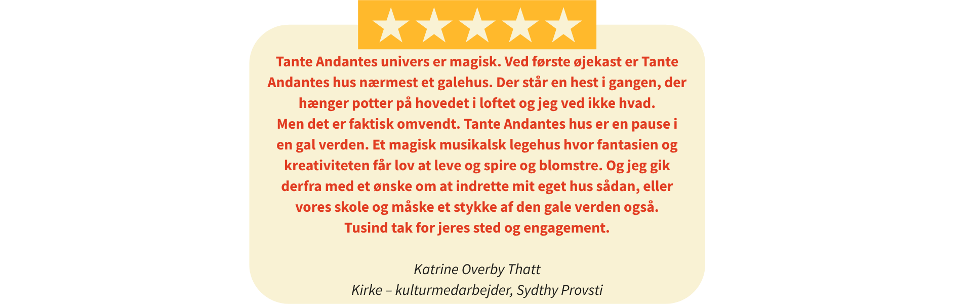 Vi har offentlig åbent i Tante Andantes Hus, Lemvig i skoleferierne. Grupper kan bestille besøg i Tante Andantes Hus, Lemvig