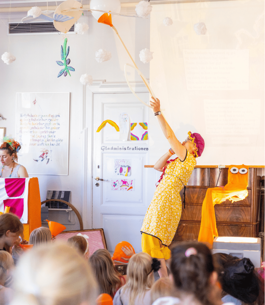 Når Tante Andantes Hus er åbent, fyldes huset med sang, fortælling, dukketeater og musik, når vi laver workshop sammen. Her kan man skråle for sine lungers fulde kraft og danse med hele kroppen. Det er altid kl. 10.30 og kl. 14.00.