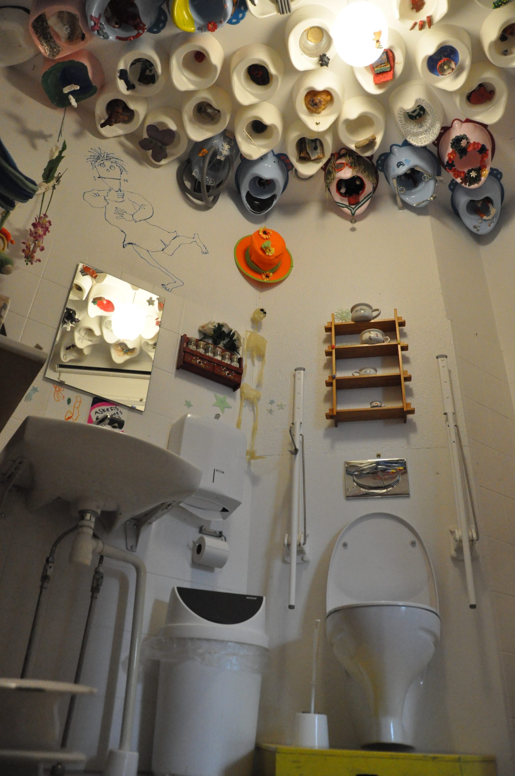 Askefistoilet “Askefis den flove, kunne ikke sove. Tabte tommeltotten lige ned i potten” Vi har kun et toilet i Tante Andantes Hus men det er til gengæld også det sjoveste i hele byen. Her hænger potter i loftet og neonlysende ting rundt omkring. Se på dit tøj om der er noget der lyser. Aksefis elsker sit toilet og man må gerne låne det – også til at skifte ble på de små.